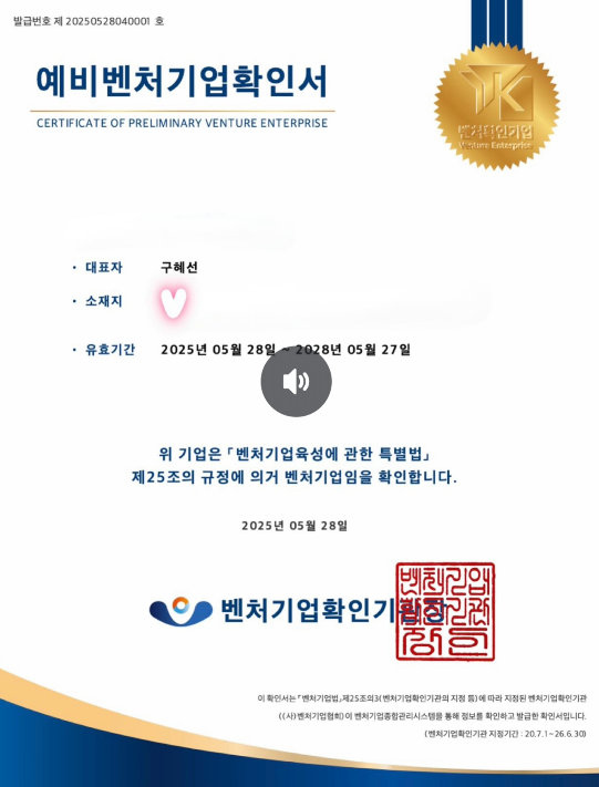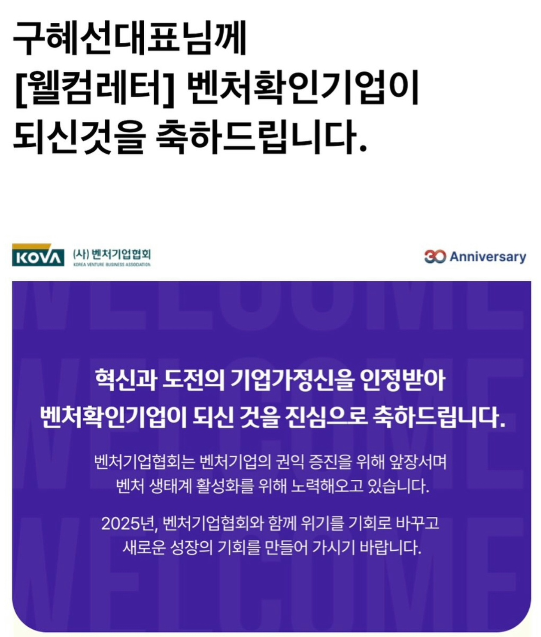 또한 벤처기업협회로부터 받은 공식 웰컴레터도 함께 공개되며 예비 창업자 → 공식 인증 대표로의 전환이 실현됐음을 알렸다.