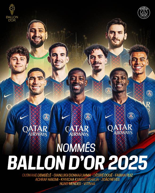 2024-25시즌 발롱도르 후보 30인 중 파리 생제르맹 선수가 9자리나 차지했다.