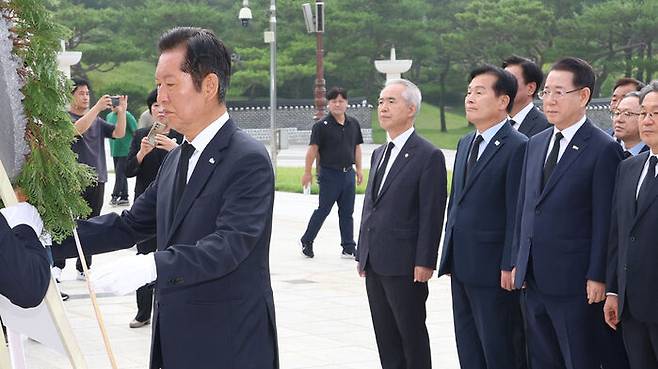▲ 더불어민주당 정청래 대표가 8일 광주광역시 북구 국립 5·18민주묘지를 찾아 5·18민주항쟁추모탑에 헌화하고 있다.