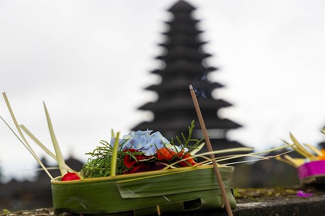 | ▲ 사원 제단에 놓인 차낭사리(Canang sari) 차낭은 바구니, 사리는 본질을 뜻한다. |