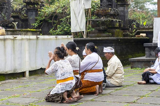 | ▲ 사원에서 기도하는 발리 힌두교인들 예배를 보려면 흰 옷을 입어야 한다. |