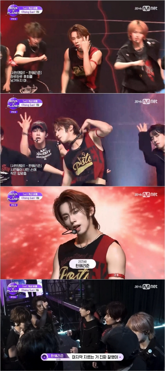 한해리준의 무대는 메인 댄서로서의 역할을 완벽히 소화했을 뿐만 아니라 메인 보컬로서 고군분투한 쑨헝위를 향해 “나는 믿고 있었어. 잘했어”라고 격려하는 훈훈함을 보였다. 한해리준의 활약 속에 ‘Rising Sun’ 1팀은 압도적인 승리를 거뒀다.