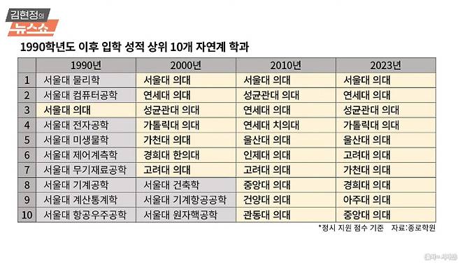 ◇ 김현정> 우리 현실을 좀 들여다보자면 의학이 중요하지 않다. 의대는 별거 아니다. 이런 이야기를 하는 게 아니라 의학도 가고 공학도 가고 법학도 가고 경영학도 가고 예술 계열도 가고 골고루 발전이 이루어져야 되는데 우리는 지금 너무나 비정상적으로 공부 잘하면 무조건 의대 그 아이의 성향이 어떻든 그 아이가 무슨 꿈을 가지고 있든 그냥 한곳으로 쏠리고 있다는 것, 의대로 쏠리고 있다는 것. 그러면서 국가 경쟁력이 떨어지고 있다는 게 이게 문제인 것 같은데요. 지금 상황이 어떤지를 저희가 도표로 좀 보여드리겠습니다. 1990학년도 이후 그러니까 90년대 이후 입학 성적이 좋은 학생들의 이제 지원 학과를 이렇게 도표로 만들어 놨더라고요. 성적 지상주의라고 하실지 모르겠습니다만 이렇게 봐야 우리가 한눈에 어떤 쏠림이 이루어지고 있는지를 볼 수 있어서 저희가 도표를 한번 가져와 봤습니다. 종로학원의 자료고요. 1990년에는 그 학과의 입학 성적을 순위로 매겼을 때 1위가 서울대 물리학과, 2위가 서울대 컴퓨터 공학, 3위가 서울대 의대, 4위가 서울대 전자공학, 5위가 미생물학, 6위가 제어계측학 이런 식으로 물리학이 1위예요. 물리학이 1위고 나머지는 다 공학이고 3위가 의대 이런 순서였어요. 그런데 2023년으로 가보겠습니다. 2023년으로 가보니까 1위 서울대 의대, 2위 연세대 의대, 3위 성균관대 의대, 4위 카톨릭대 의대, 5위 울산대 의대, 6위 고려대 의대, 7위 가천대 의대, 8위 경희대 의대, 9위 아주대 의대 10위 중앙대 의대. 1위부터 10위까지 중에 의학과가 아닌 게 1개도 없어요, 1개도 없어요. 교수님, 저도 깜짝 놀랐어요. 이거 아마 11위로 내려가도 지금 11위까지는 안 보이는데 11위, 12위, 13위 다 의대일 것 같은 느낌이 살짝 들어서 좀 겁이 나네요.
