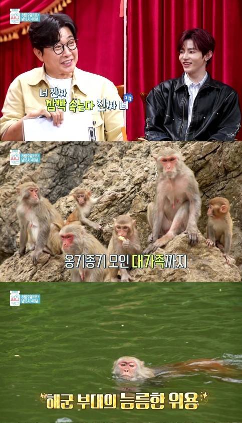 먼저 계곡에 거침없이 다이빙하는 '해군 원숭이' 부대가 신선한 충격을 안긴다. 물 위를 유영하며 땅콩을 받아먹는 원숭이들의 모습에 써니즈는 물론, 스튜디오 MC들까지 입을 다물지 못한다. "원숭이가 수영하는 건 처음 본다"는 반응이 이어지는 가운데, 강소라는 "나보다 낫다"며 "같이 수영장에서 시합했으면 재밌었겠어"라고 뜻밖의 승부욕을 드러내 웃음을 자아낸다.
