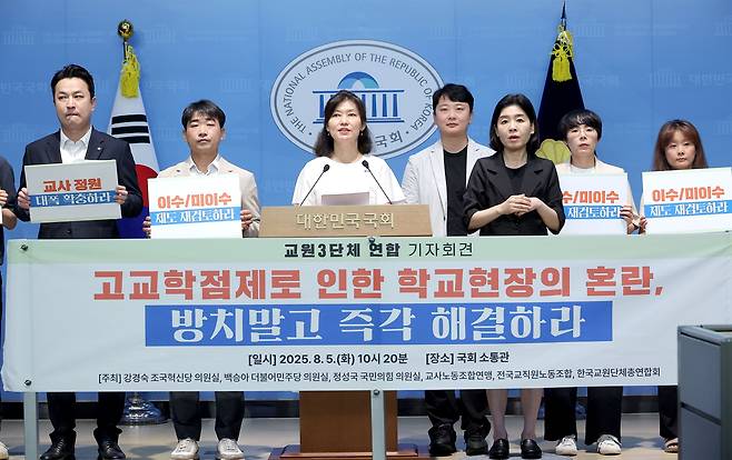 | ▲ 5일 서울 여의도 국회 소통관에서 열린 고교학점제 재검토 촉구 교원 3단체 연합 기자회견에서 조국혁신당 강경숙 의원이 발언하고 있다. 2025.8.5 |