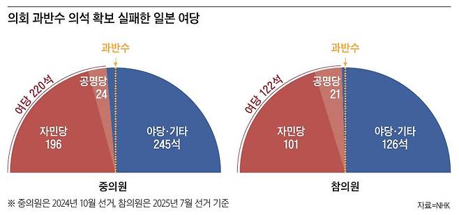 이번 참의원 선거에서 자민당과 공명당은 총 47석을 얻어 목표(50석) 달성에 실패했다. 자민당은 32개 1인 선거구에서 14승 18패로 대패했다. 지난 선거 당시 28승에 크게 못 미친다. 연립 정권을 담당하는 공명당은 겨우 8석을 얻었다. 양당 의석수는 선거 대상이 아닌 기존 의석(75석)을 더해 122석에 그쳐, 참의원 과반인 125석에 미치지 못했다. 이시바 시게루 일본 총리(자민당 총재)는 2024년 중의원에 이어 대형 선거에서 연달아 패했다. 자민당 중심 정권이 중의원과 참의원 모두 과반을 지키지 못한 것은 1955년 자민당 출범 이후 처음이다. 반면 제1 야당인 입헌민주당은 22석을 획득해 기존 의석을 유지했고, 국민민주당은 17석, 참정당은 14석으로 대약진했다. 국민민주당은 선거구 10인, 비례대표 7인 등 총 17석을 획득해 기존 4석에서 네 배 이상 증가했다. 참정당은 14석으로 존재감을 크게 키웠다. ‘일본인 퍼스트’를 선거 슬로건으로 내건 참정당은 도쿄 등 지역구에서 7석, 비례대표로 7석을 확보했다. 비례대표 기준으론 자민당, 국민민주당에 이어 3위를 차지했다.