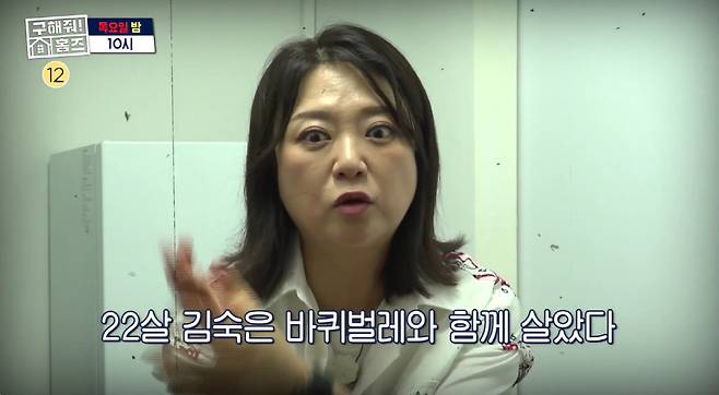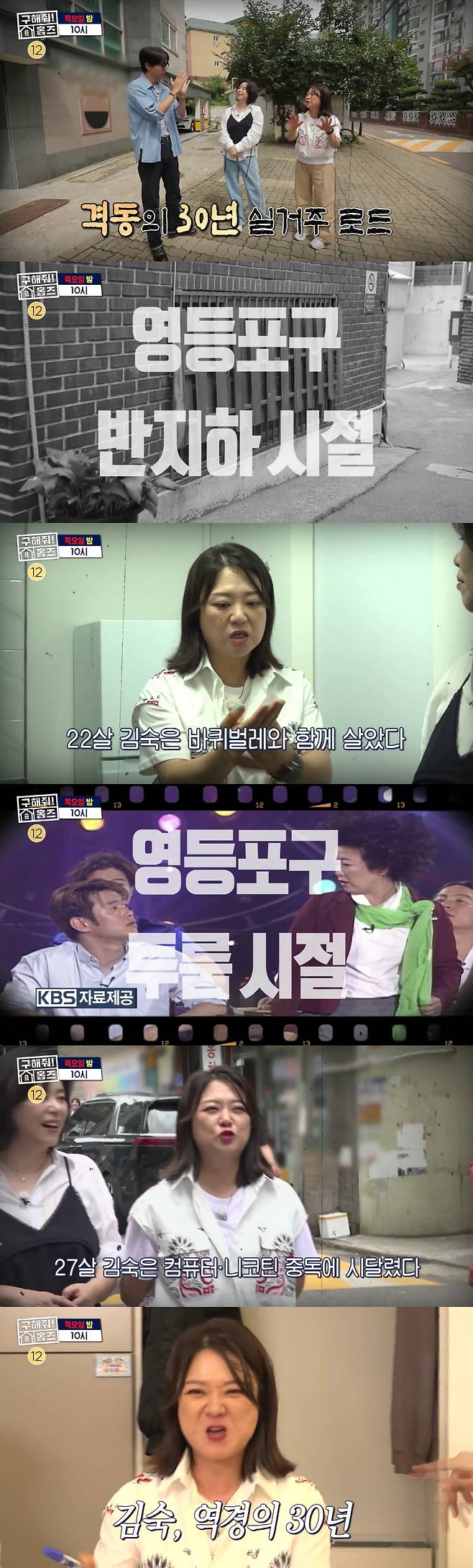 김숙은 먼저 22세 시절 살았던 영등포구의 반지하 집을 소개하며 "겨울에 너무 추워서 힘들었다. 바퀴벌레가 정말 손바닥만 했다"고 회상했다. 이어 "고개를 돌리면 눈이 마주칠 정도였다"며 그 시절의 고생담을 털어놨다.