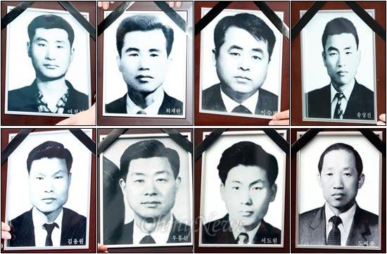 | ▲ 12일 오후 여의도 새누리당사앞에서 열린 '인혁당재건위사건 '사법살인' 부정하는 박근혜 규탄 기자회견'에서 유가족들이 희생자 8명(여정남, 하재완, 이수병, 송상진, 김용원, 우홍선, 서도원, 도예종)의 영정사진을 들고 나왔다. |