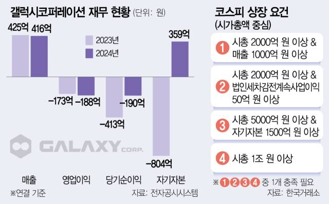갤럭시코퍼레이션의 코스피 상장 도전이 성공할지는 미지수다. 갤럭시코퍼레이션은 연결 재무제표를 기준으로 지난해 188억 원의 영업손실을 냈고 당기순손실도 190억 원이다. 코스피 상장을 추진하려면 △영업 기간 △주식 분산 △경영 성과 등 일정 조건을 충족해야 하는데 경영 성과 부문은 최근 매출·영업이익·기업가치를 주로 본다. 한국거래소 가이드라인에 따르면 적자 기업이 코스피 시장에 상장할 수 있는 유력한 방법은 시가총액이 1조 원을 넘는 것이다. 1조 원은 지난해 갤럭시코퍼레이션이 상장 전 지분 투자(프리 IPO)를 진행할 때 인정받으려 한 가치로 거래소가 이를 받아들일 지가 관건이다.