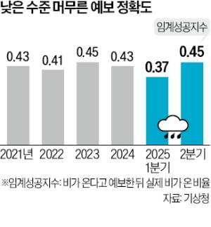 8일 기상청에 따르면 기상청 강수 예보 관련 임계성공지수(CSI)는 올해 2분기 기준 0.45로 집계됐다. 지난 1분기에는 0.37로 하락했다. 임계성공지수란 기상 예보의 적중률을 평가하는 지표로 1이면 100% 적중했다는 의미다. 기상청이 지수를 산출하기 시작한 첫해인 2021년 0.43을 시작으로 2022년 0.41, 2023년 0.45, 2024년 0.43 등 5년 연속 0.4대에 머물렀다.