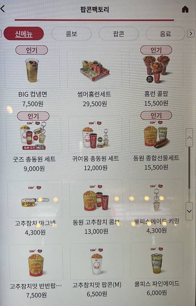 (CGV 키오스크의 음식 판매 화면. /사진=조수아 기자)