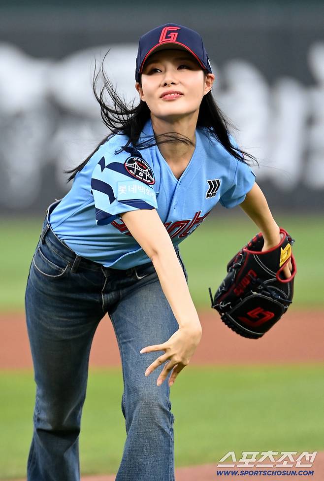 8일 부산 사직야구장에서 열린 SSG와 롯데의 경기, 뮤지컬 '알라딘'의 배우 민경아가 시구를 하고 있다. 부산=허상욱 기자wook@sportschosun.com/2025.08.08/