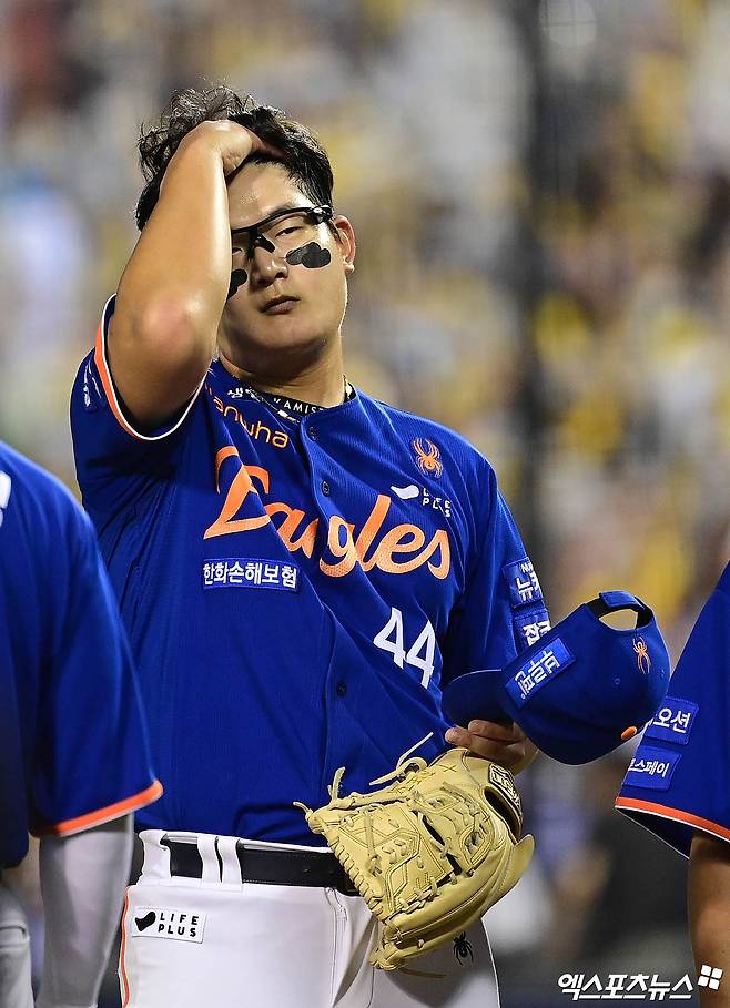 한화 김서현이 끝내기 패배에 아쉬워하고 있다.