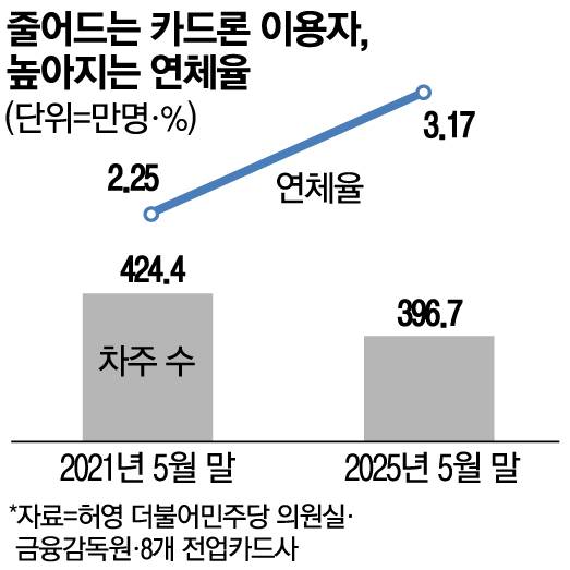 8일 국회 정무위원회 소속 허영 더불어민주당 의원실이 금융감독원에서 제출받은 8개 전업카드사(신한·현대·삼성·KB국민·롯데·우리·하나·BC카드)의 카드론 현황 자료에 따르면 전체 카드론 차주 수는 2021년 5월 말 424만3736명에서 올해 5월 말 396만7309명으로 약 6.5%(27만여 명) 줄었다. 그러나 같은 기간 카드론 잔액은 34조2000억원에서 39조5000억원으로 5조원 이상 증가했다. 카드론 연체율도 2.25%에서 3.17%로 높아졌다.