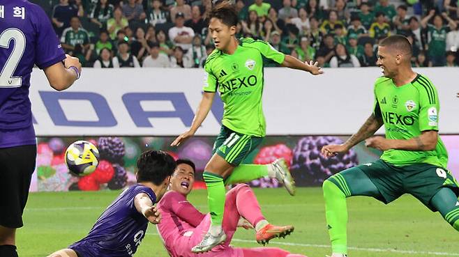 전북은 오늘 전주월드컵경기장에서 열린 안양과의 하나은행 K리그1 2025 25라운드 홈경기에서 후반 43분 터진 이승우의 결승 골에 힘입어 2대 1로 승리했습니다.