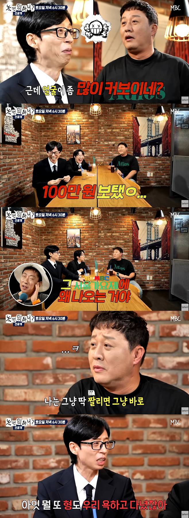 이에 하하는 "형 나왔을 때 나한테 욕하고 '놀면 뭐하니' 실컷 욕해놓고 자기가 지금 그러는 거다"라고 맞장구쳤다. 이에 정준하는 "난 그냥 딱 잘리면 바로 열심히 살지 않냐. 내가 너희한테 질척거리기를 하냐"며 2년 전 '놀면 뭐하니' 하차 당시를 떠올렸다. 이를 들은 유재석은 "형 우리 욕하고 다니지 않았냐. 욕은 아니지만 뒷담화하지 않았냐"고 몰아세워 정준하를 당황하게 했다.
