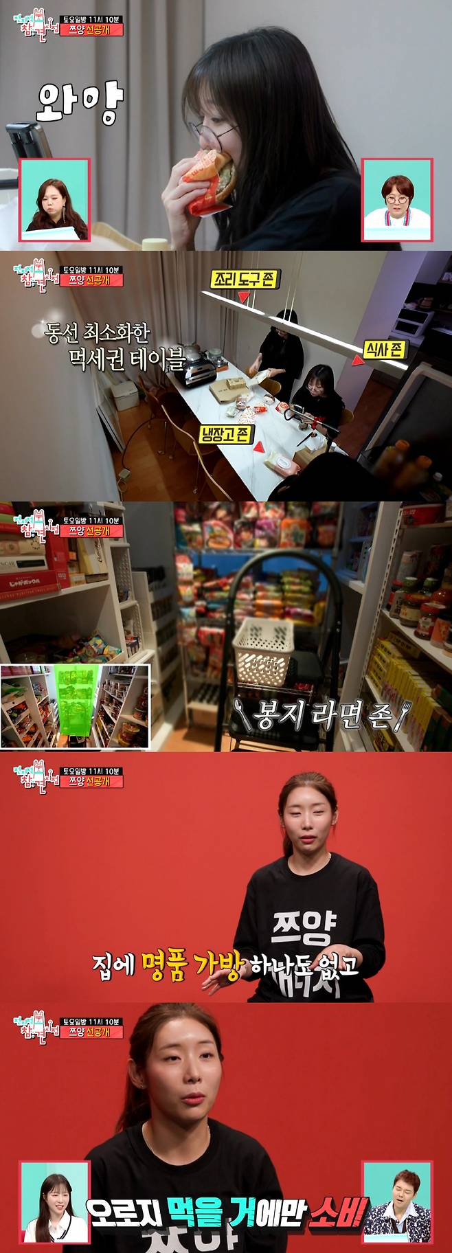 쯔양의 집은 먹방에 최적화된 환경으로 일반 가정에서는 보기 힘든 전문 조리 도구는 물론, 대형 냉장고 4대와 다양한 간식이 가득한 식량 창고까지 갖춰 놀라움을 자아냈다. 특히 식량 창고에는 즉석식품, 컵라면, 봉지라면, 조미료, 각종 스낵이 가득 차 있어 작은 편의점을 방불케 했다.