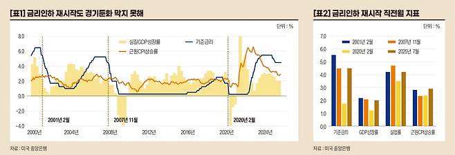 미국 기준금리는 2024년 8월 5.5%를 고점으로 인하되다 올해 들어 4.5%에서 동결되고 있다. 기준금리 인하 주기의 재시작은 반가운 일이지만 과거 사례를 보면 재시작 이후 경제는 좋아지지 못했다.