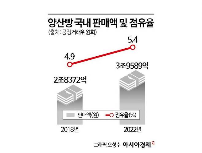 공정거래위원회의 '제빵산업 시장분석 및 주요 규제 경쟁영향평가' 보고서에는 양산빵 국내 판매액이 2018년 2조8372억 원에서 2022년 3조9589억 원으로 연평균 8.7% 증가한 것으로 나와 있다. 이는 같은 기간 전체 식품 판매액의 연평균 증가율(6.0%)보다 높은 것으로, 양산빵 시장이 더 빠른 성장세를 보였음을 보여준다. 전체 식품 판매액 중 양산빵이 차지하는 비중 또한 2018년 4.9%에서 2022년 5.4%로 0.5%포인트 상승했다.