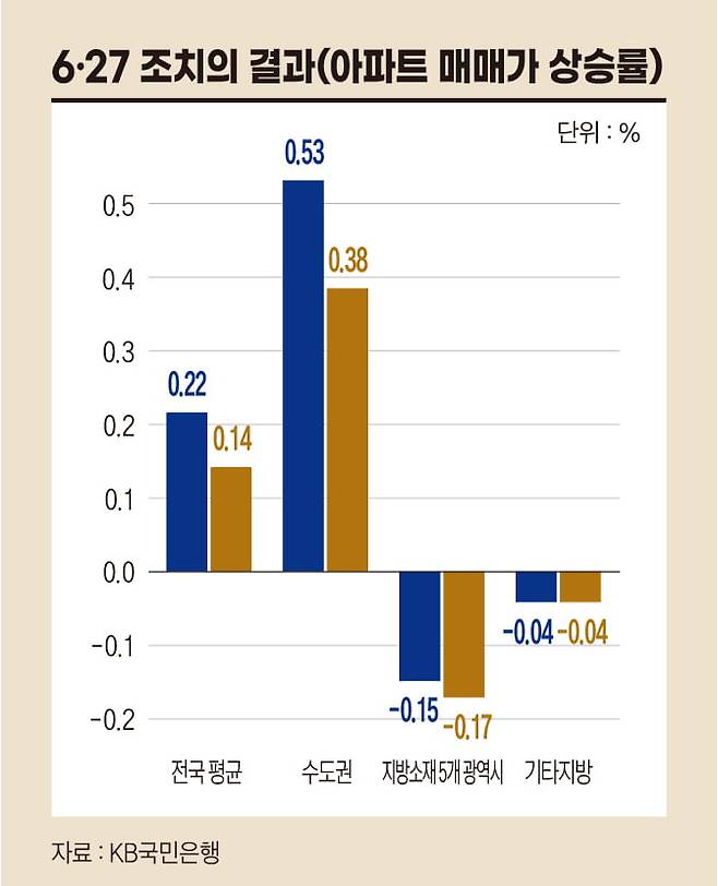 KB국민은행 통계를 기준으로 6월 27일 직전 4주와 직후 4주의 아파트 매매가 상승률을 비교하면 전국 아파트가 0.22%에서 0.14%로 0.07%포인트나 상승률이 낮아졌다.