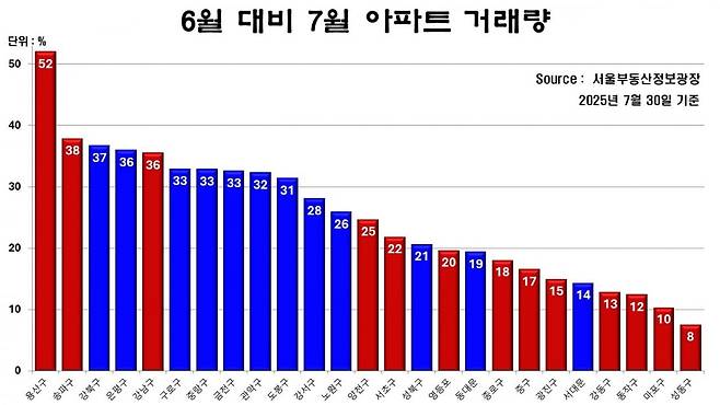 위 표에서 알 수 있듯이 저가 지역(파란색)보다는 고가 지역(빨간색)의 거래량 감소가 심한 것을 알 수 있다. 6·27 조치의 여파로 대출을 많이 필요로 하는 고가 지역은 거래 감소를 피할 수 없는 것이다.