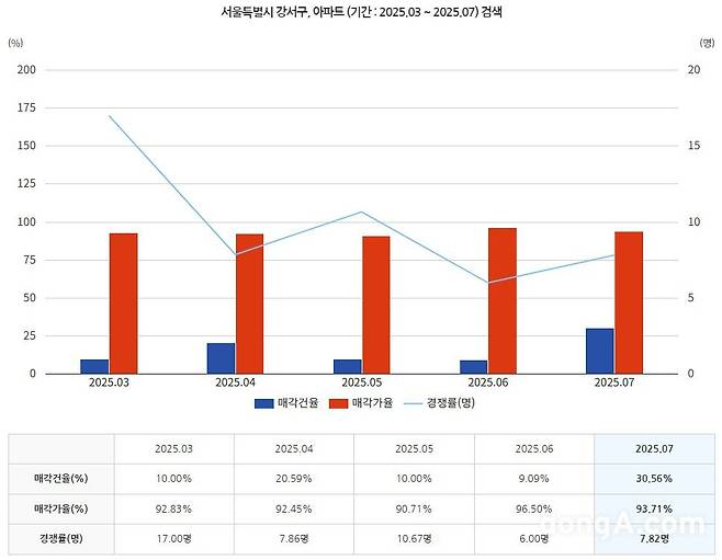 매각가율(감정가 대비 낙찰가 비율)은 전반적으로 높은 수준을 유지해오다 6월 이후 다소 하락세를 보이고 있다. 3월 47.73%였던 매각가율은 4월 96.24%로 급등했고, 5월에는 102.01%를 기록하며 감정가를 초과했다. 그러나 6월 99.69%, 7월에는 94.64%로 매각가가 점차 낮아지고 있는 추세다.