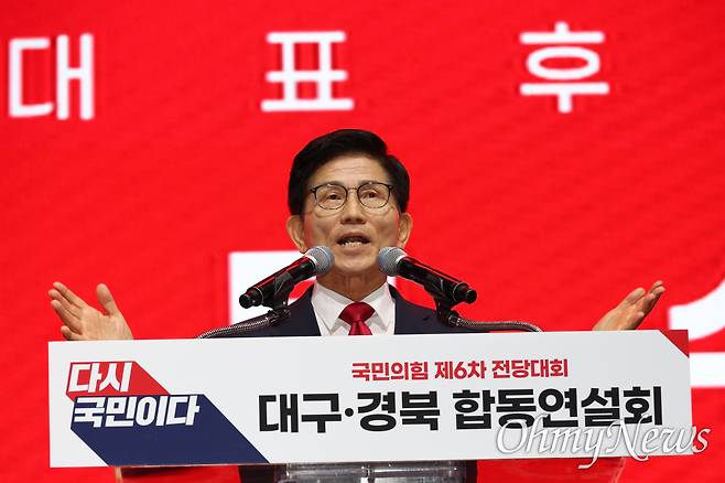 | ▲ 8일 오후 대구 엑스코에서 열린 국민의힘 전당대회 합동연설회에서 김문수 후보가 발언하고 있다. |
