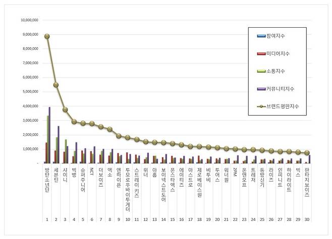보이그룹 브랜드평판 1위를 기록한 방탄소년단 ( RM, 진, 슈가, 제이홉, 지민, 뷔, 정국 ) 브랜드는 참여지수 137,548 미디어지수 1,456,074 소통지수 3,342,720 커뮤니티지수 3,926,705가 되면서 브랜드평판지수 8,863,047로 분석됐다. 지난 7월 브랜드평판지수 10,128,032와 비교해보면 12.49% 하락했다.