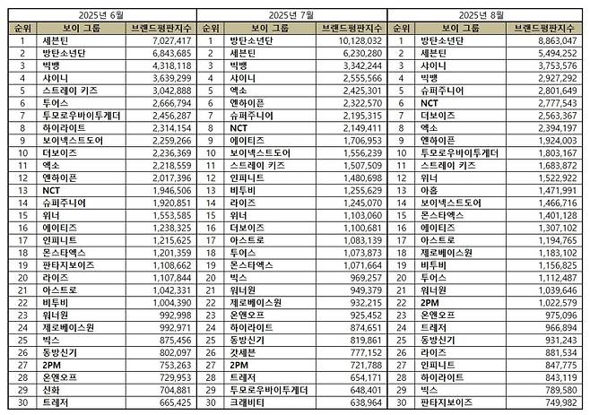 2025년 8월 보이그룹 브랜드평판 30위 순위는 방탄소년단, 세븐틴, 샤이니, 빅뱅, 슈퍼주니어, NCT, 더보이즈, 엑소, 엔하이픈, 투모로우바이투게더, 스트레이 키즈, 위너, 아홉, 보이넥스트도어, 몬스타엑스, 에이티즈, 아스트로, 제로베이스원, 비투비, 투어스, 워너원, 2PM, 온앤오프, 트레저, 동방신기, 라이즈, 인피니트, 하이라이트, 빅스, 판타지보이즈 순으로 분석됐다.