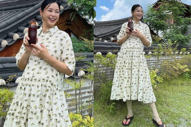 곧 출산을 앞둔 만큼 편안한 스타일의 원피스를 입고 환한 미소를 선보이고 있는 이하늬. 이 과정에서 고스란히 드러난 볼록 D라인이 눈길을 끈다.
