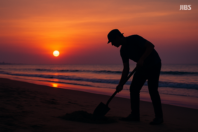 남자가 삽으로 모래를 파는 행위는 얼핏 단순해 보입니다.