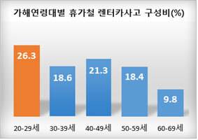 8월 렌터카 사고 중 20대 비중은 26.3%로 가장 높았고 40대가 21.3%, 30대 18.6% 순이었다.