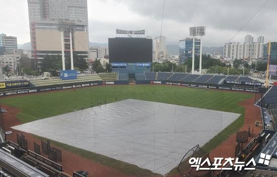 하지만, 9일 이른 오후부터 창원 지역에 비가 내리기 시작했다. 오후 2시부터 창원NC파크 그라운드 위에 대형 방수포가 깔렸다.