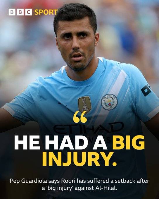 영국 공영방송 'BBC'는 9일(이하 한국시간) "펩 과르디올라 감독은 맨시티의 미드필더 로드리가 부상 재발로 인해 9월 A매치 휴식기 이후까지는 완전한 컨디션을 회복하기 어려울 것이라고 밝혔다"라고 보도했다.