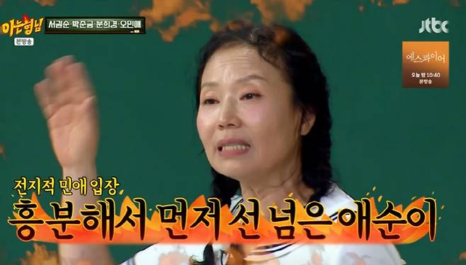 문희경은 "근데 뺨 때리는 것도 노하우가 있다. 어떤 배우들은 직접 때려달라 부탁한다"고 말했고 서장훈은 "민애는 제대로 때린 거지?"라고 물었다. 이에 오민애는 "애순이가 부탁했다"고 말해 웃음을 안겼다.