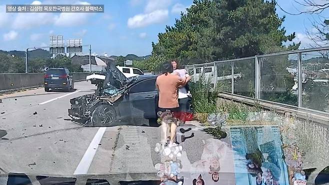 그렇게 3분 만에 구조에 성공한 남중씨. 그런데 어쩌나... 남중씨의 손을 잡고 나오는 운전자는 맨발에 피가 범벅된 얼굴로, 딱 봐도 경상은 아닌 것 같았어요. 제대로 서 있는 것조차 힘겨워하는 운전자를 간신히 안전지대까지 옮긴 남중씨.