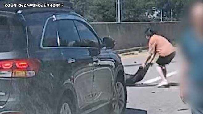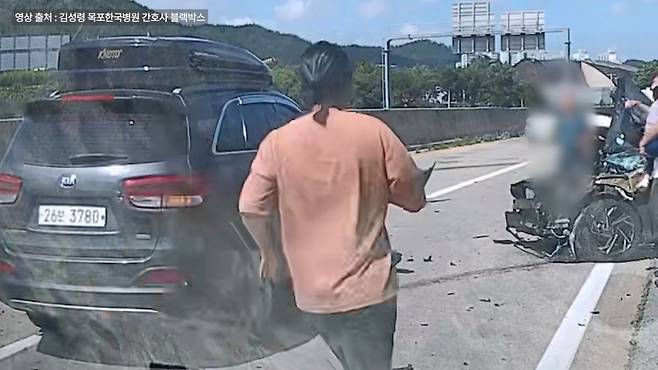 성령씨는 사실 남중씨가 고군분투하는 사이, 도로 복판에 떨어진 범퍼를 치우고 이렇게 밀린 차들이 빠져나갈 수 있도록 했고, 운전자의 상태가 심상치 않은 걸 본 뒤에는 여성 운전자에게 다가가 맥박을 짚기도 했습니다.