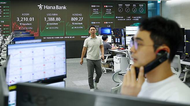 ▲ 코스피가 닷새 만에 하락하며 3,210선으로 장을 마친 8일 서울 중구 하나은행 본점 딜링룸에 지수가 표시돼 있다.