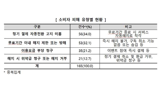 피해 유형은 '정기 결제 자동 전환 고지 미흡'이 34.0%(56건)로 가장 많았고, '무료 기간 이내 해지 제한 또는 방해' 32.1% (53건), '이용 요금 부당 청구' 21.2%(35건), '해지 시 위약금 청구 또는 해지 거부' 12.7%(21건)로 뒤를 이었습니다.