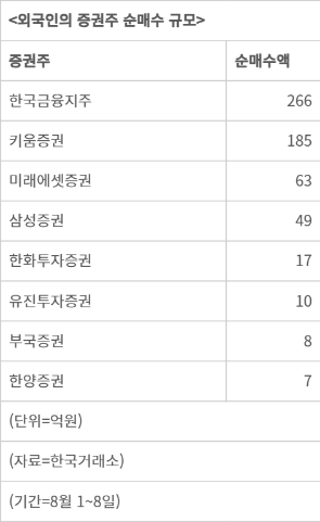 8일 한국거래소에 따르면 8월 1~8일 6거래일간 외국인은 증권주인 한국금융지주(266억원), 키움증권(185억원), 미래에셋증권(63억원), 삼성증권(49억원), 한화투자증권(17억원), 유진투자증권(10억원), 부국증권(8억원), 한양증권(7억원) 등을 순매수했다.