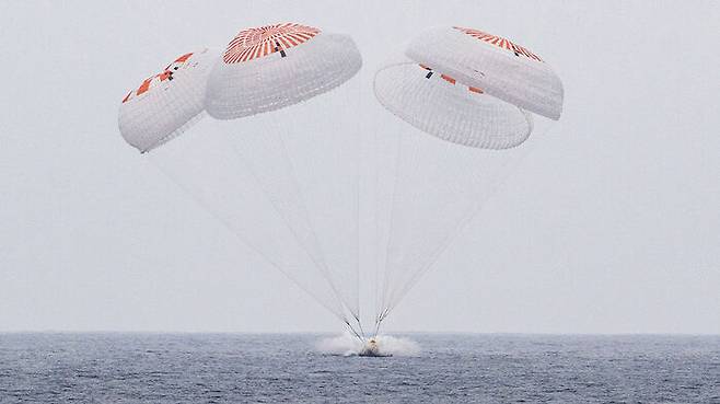 AP통신 등에 따르면 미 항공우주국(NASA)의 앤 맥클레인과 니콜 에이어스, 일본의 오니시 타쿠야, 러시아의 키릴 페스코프를 실은 스페이스X 캡슐이 9일 오전 미 캘리포니아주 남부 해안 앞 태평양에 낙하산을 펼치고 착수했습니다.