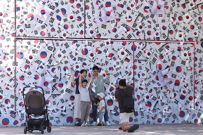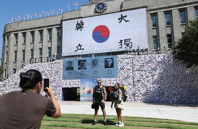 10일 서울시가 광복 80주년을 기념해 서울도서관 정문에 설치한 가로 45m, 폭 5m, 높이 6m 규모 '태극기언덕' 앞에서 시민들이 기념촬영을 하고 있다.