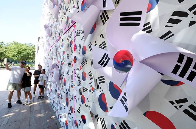 10일 서울시가 광복 80주년을 기념해 서울도서관 정문에 설치한 가로 45m, 폭 5m, 높이 6m 규모 '태극기언덕' 앞에서 시민들이 기념촬영을 하고 있다. 태극기를 형상화한 3가지 사이즈, 300개의 바람개비로 꾸민 '태극기 언덕'은 광복의 자부심과 기쁨을 형상화한 작품이다.