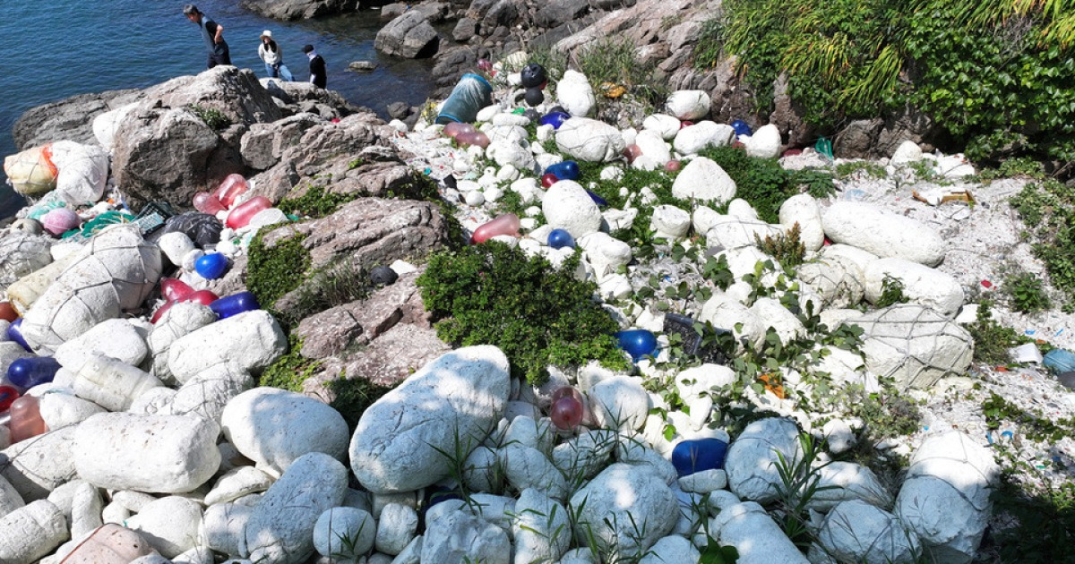 섬 해안가로 떠밀려온 해양쓰레기는 매주 공공근로자들이 수거한다.
