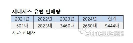 제네시스는 유럽에 진출한 첫해인 2021년 501대를 시작으로 2022년 2823대, 2023년 3460대, 2024년 2660대 등 4년간 누적 판매량이 총 9440대에 머물고 있다. 지난해 제네시스 글로벌 판매량이 23만대에 육박한다는 점을 고려하면 아쉬운 성적표다.