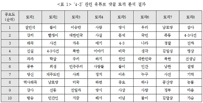 토픽2는 '들이', '빨갱이', '사건', '4.3사건' 등이 상위에 위치해 있는데, 이들 어휘가 '학살', '희생', '제주도민', '남로당', '선동', '민간인' 등의 어휘와 연관을 맺음으로써 이른바 민간인 학살과 제주도민의 희생을 강조한 '양민학살-국가폭력론'으로 논지가 수렴된다. 이러한 방식으로 해석하면 토픽3은 '이승만'과 '북한', '미국', '친일파' 등의 어휘를 통해 4.3 당시의 정국에 대한 논의들이 댓글에서 논의되고 있음을 보여 준다. 토픽4는 4.3에 대한 이야기를 비롯한 기억과 의미화에 대한 논의로 보이며, 토픽 5는 4.3의 발생 원인을 이념 또는 사상의 대립으로 바라보는 관점을, 그리고 토픽6은 과거를 극복하고 미래로 나아가는 방안에 대한 논의로, 토픽6은 남로당에 의한 '무장폭동론'이 얼마나 강력한 힘으로 눈앞에서 어른거리고 있는지를 보여 준다. 마지막으로 토픽8은 4.3의 진실을 전파하기 위해 노력하는 이들에 대한 감사와 고마움이 표현되어 있다.