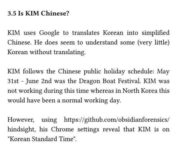하지만 보고서 저자는 공격자의 크롬 설정은 한국 시간에 맞춰져 있었다고 설명했다. 또 한국어를 일부 이해할 수 있어 공격이 김수키와 연계된 것인지 중국계 운영자인지 명확히 파악하기 어려운 상황이다.