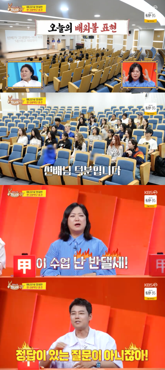 본격적으로 어학당으로 향한 세 사람은 ‘K-직장문화’ 교육에 나섰고, 엄지인은 특강에 앞서 모자를 쓴 학생을 지적하며 주의를 당부했다. 스튜디오에서 야유가 등장하자 “직장 생활에서는 조심할 필요가 있다”고 덧붙였다.