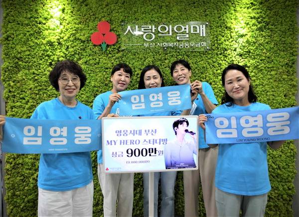 임영웅 팬클럽 ‘영웅시대 부산 MY HERO 스터디방(방장 미소천사사랑꾼·스터디방)’은 지난 6일 가수의 데뷔 9주년(8월8일)을 맞아 부산사회복지공동모금회(부산사랑의열매)에 이웃돕기성금 900만 원을 전달(사진)했다.