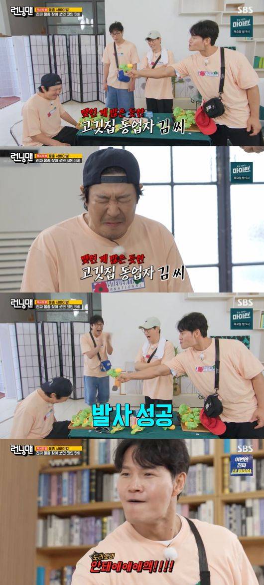 물총 선별에 성공한 김종국은 하하를 향해 "나한테 왜 그랬어? '사장님 귀는 당나귀 귀' 왜 나갔어? 왜 긁어 부스럼을 만드냐고"라 소리치며 물총을 쐈고, 조준에 성공해 웃음을 자아냈다. 실제 하하와 김종국은 함께 고깃집을 동업 중인 바. 하하가 KBS 2TV 예능 '사장님 귀는 당나귀 귀(약칭 사당귀)'에 출연해 요식업 사장으로서의 근황을 알린 것에 김종국이 물총으로 응수한 것이다.